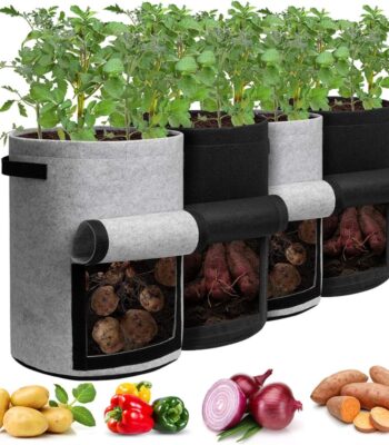 Potato Grow Bags with Flap 10 Gallon, 4 Pack Planter Pot with Handles and Harvest Window for Potato Tomato and Vegetables, Black and Gray